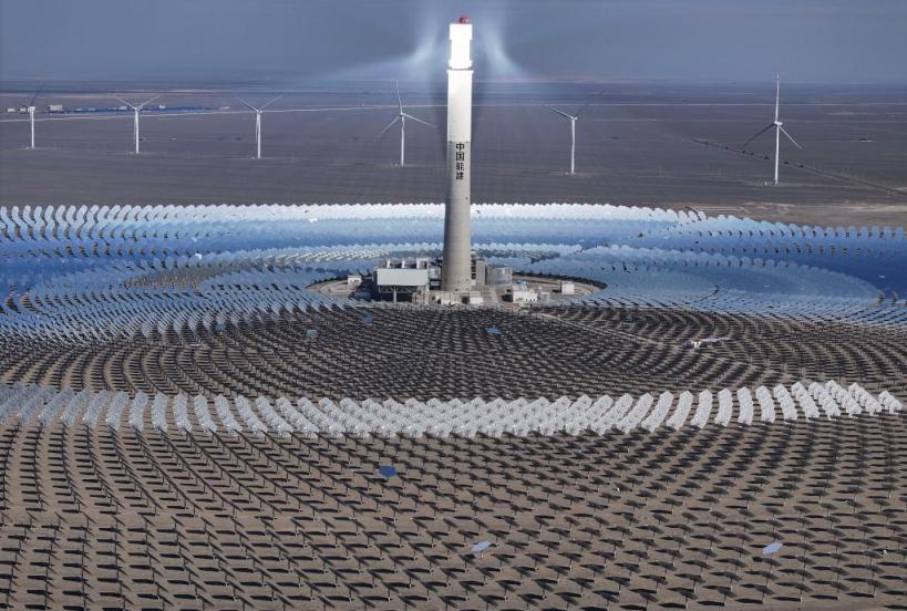 这是2024年9月12日在新疆哈密市伊吾县淖毛湖镇拍摄的国度光热示范技俩——熔盐塔式50兆瓦光热发电站(无东说念主机像片)。新华社记者 胡虎虎 摄