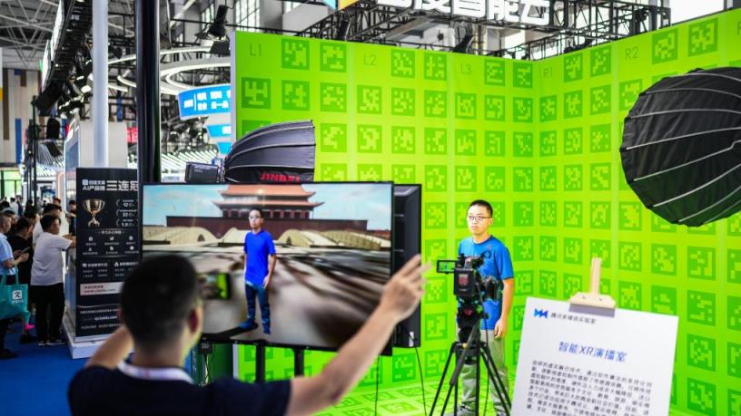 2024年8月28日,参不雅者在数博会展馆内体验智能XR演播室。新华社记者 陶亮 摄