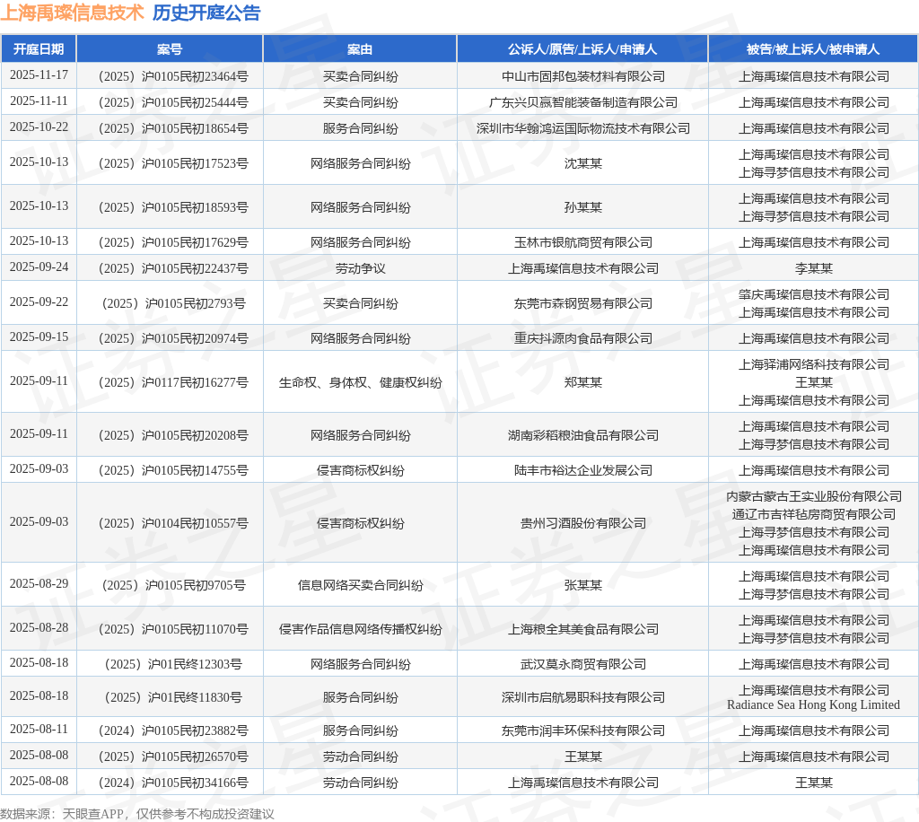 本站音问,证明天眼查APP解析,近日公布了一则上海禹璨信息时间有限公司当作被告/被上诉东说念主的开庭公告,瞩目本体如下: